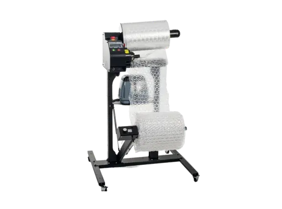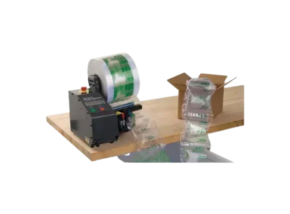 Sistema de relleno mediante la producción de bolsas de aire al momento de su uso. El equipo es de uso sencillo y ágil: permite programar los metros a fabricar y detecta, mediante un sensor, el film de la bobina para su sustitución.